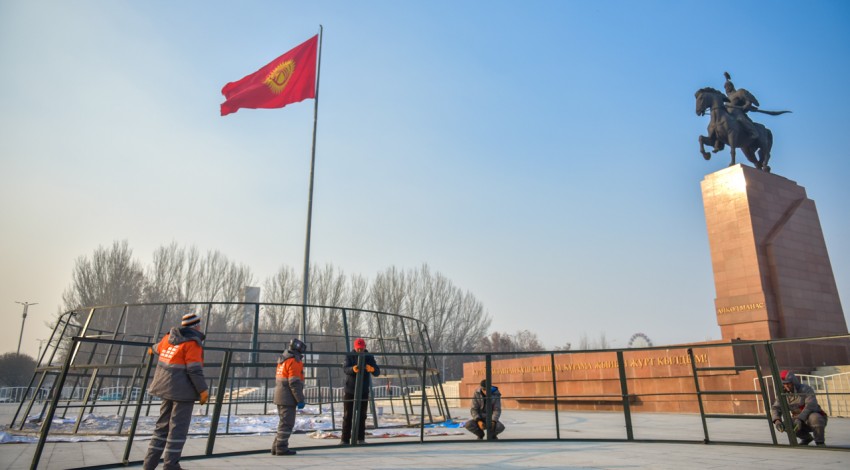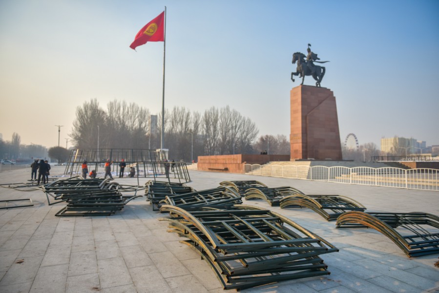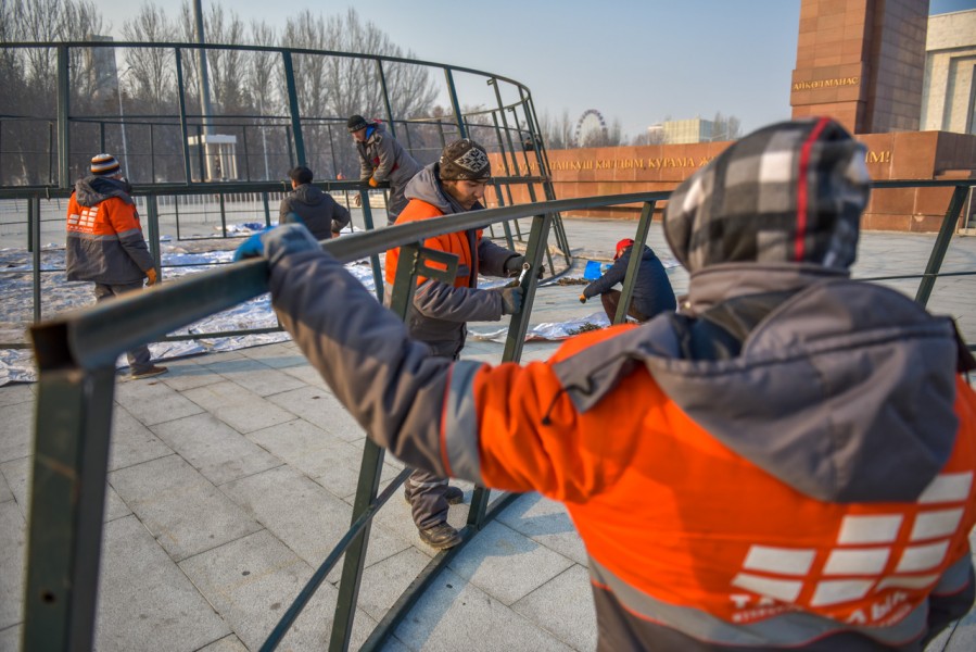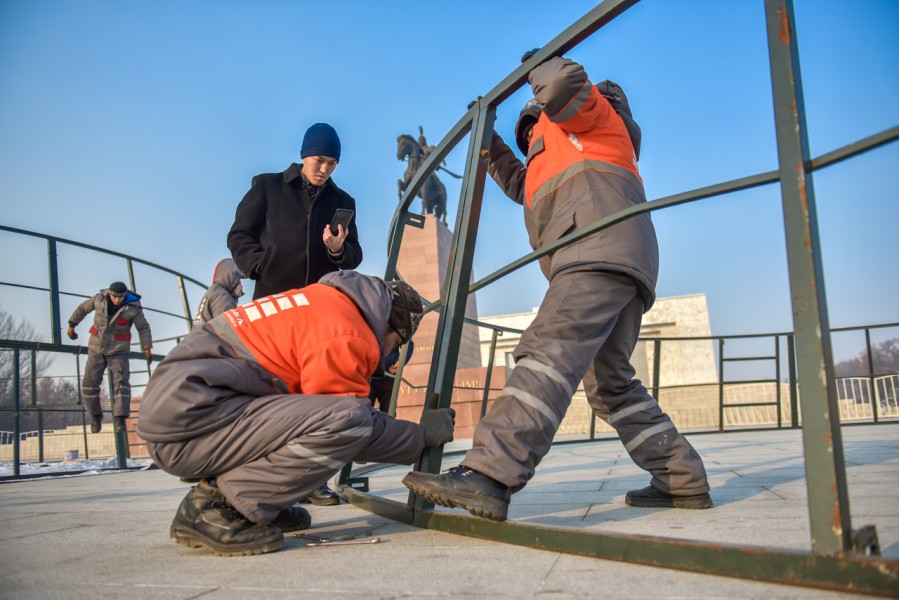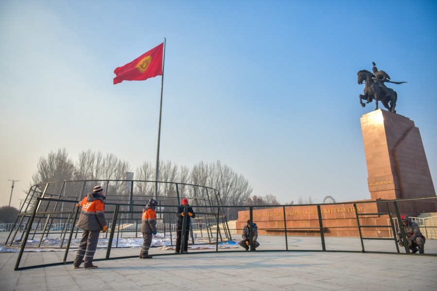 На центральной площади Бишкека начат монтаж металлического каркаса главной елки страны.