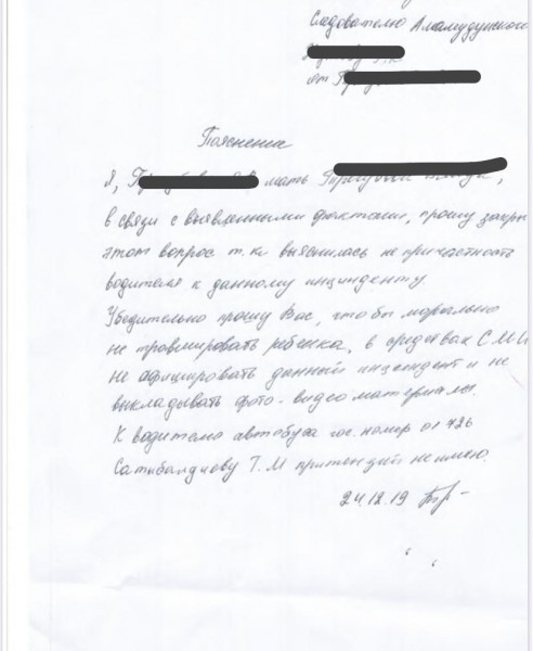 Мама ребенка Я.Т извинилась перед нашим водителем, сославшись, что сын сказал неправду, а также попросила не выкладывать видео и фотофакты, не травмировать ее ребенка. К Т. Сатыбалдиеву претензий нет, он продолжит работу в команде бишкекского пассажирского автотранспортного предприятия. Дорогие родители! Убедительно просим сначала все-таки разобраться в любой ситуации, жизнь человеческая это удивительный феномен, и нам надо беречь друг друга. Спасибо!