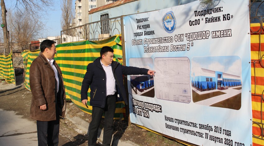 Второй социальный строящийся объект на территории района - физкультурно-оздоровительный комплекс имени Р. Санатбаева в микрорайоне «Восток-5». Прямо сейчас подрядная компания «Бийик-KG» заливает фундамент здания.
