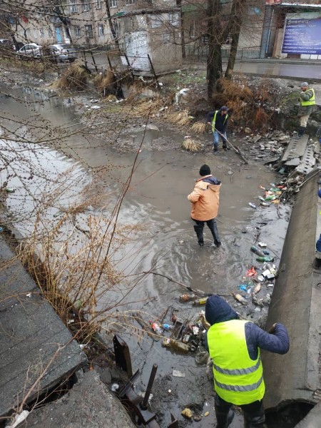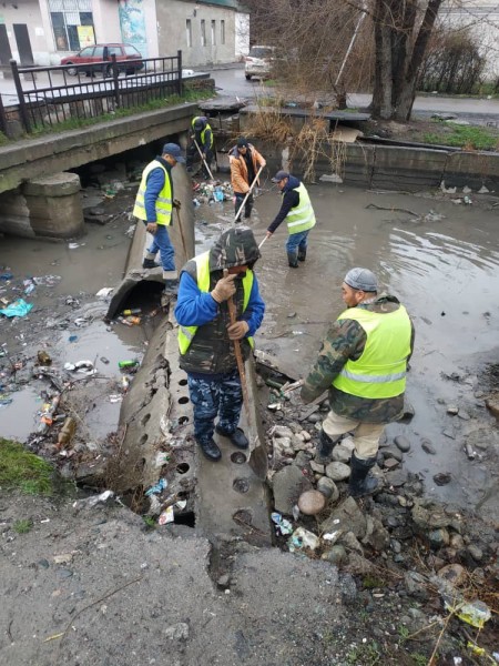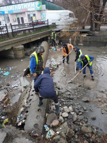 Несмотря на весенний дождь, ответственные сотрудники муниципального предприятия «Бишкекзеленхоз» очищают русло восточного канала БЧК.