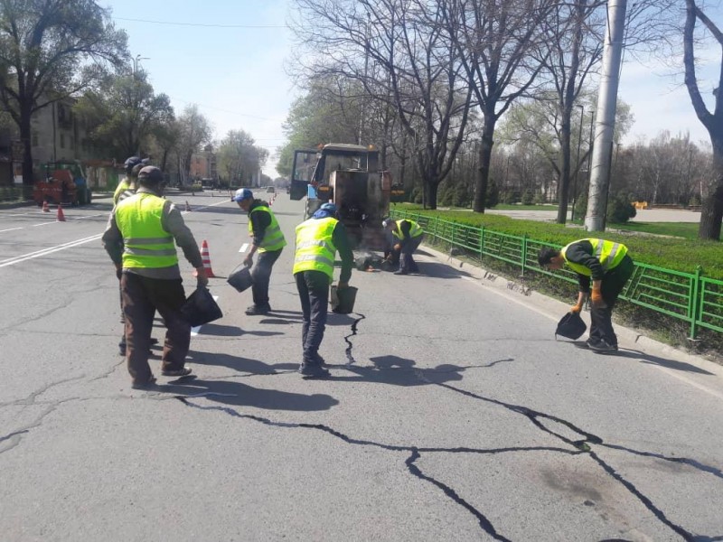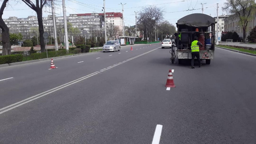 Сотрудники муниципального предприятия «Бишкекасфальтсервис» обновляют разметку на столичных улицах.