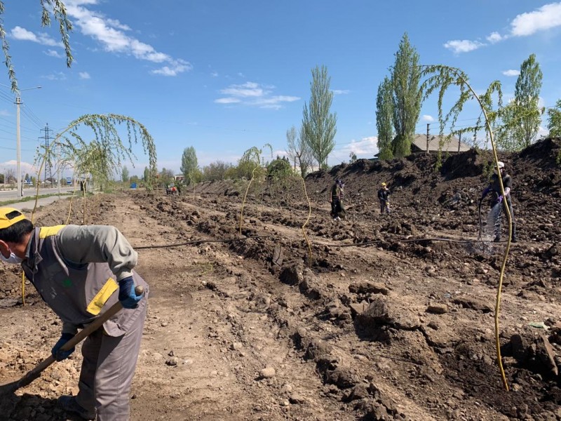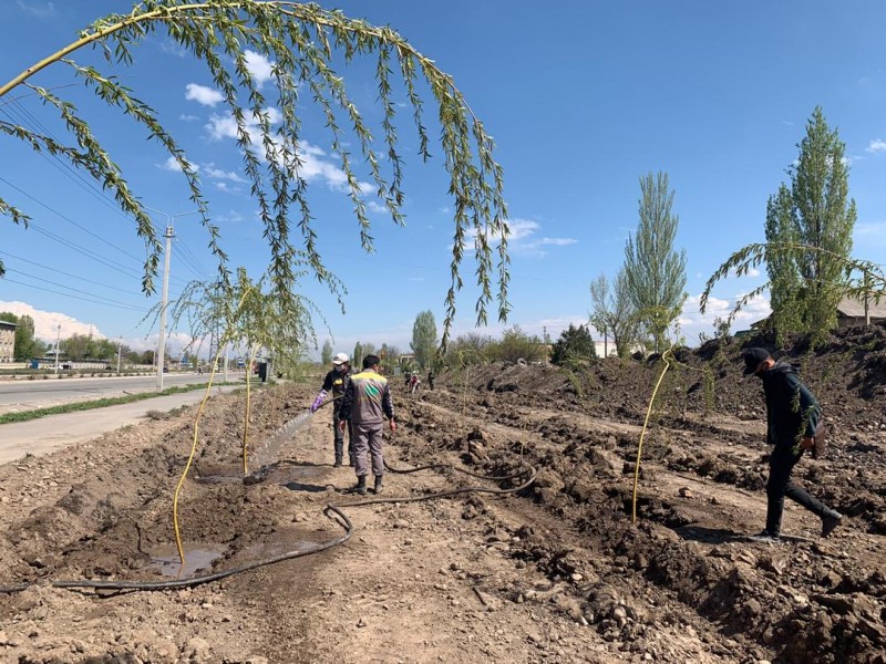 За сегодня высажено 72 саженца ивы плакучей и 93 саженца клёна от улицы Патриса Лумумбы до улицы Кайназаровой. Бишкекчане, наверное, помнят, что ранее на этом участке мы провели планировочные работы, завезли растительный грунт.