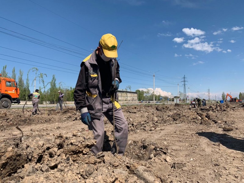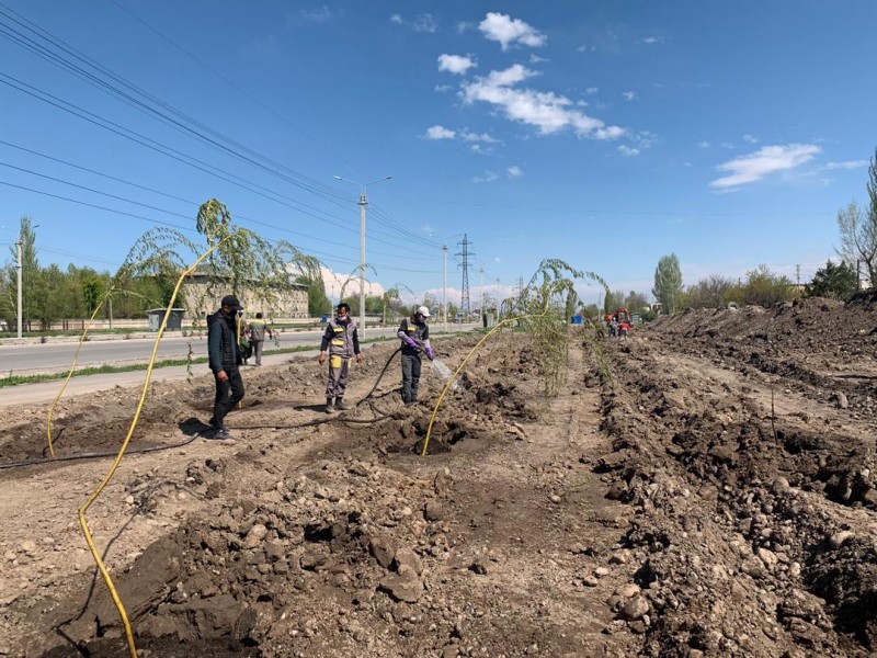 Город продолжает работу. Сотрудники муниципального предприятия «Бишкекзеленхоз» приступили к озеленению улицы Профсоюзной в северной части города.