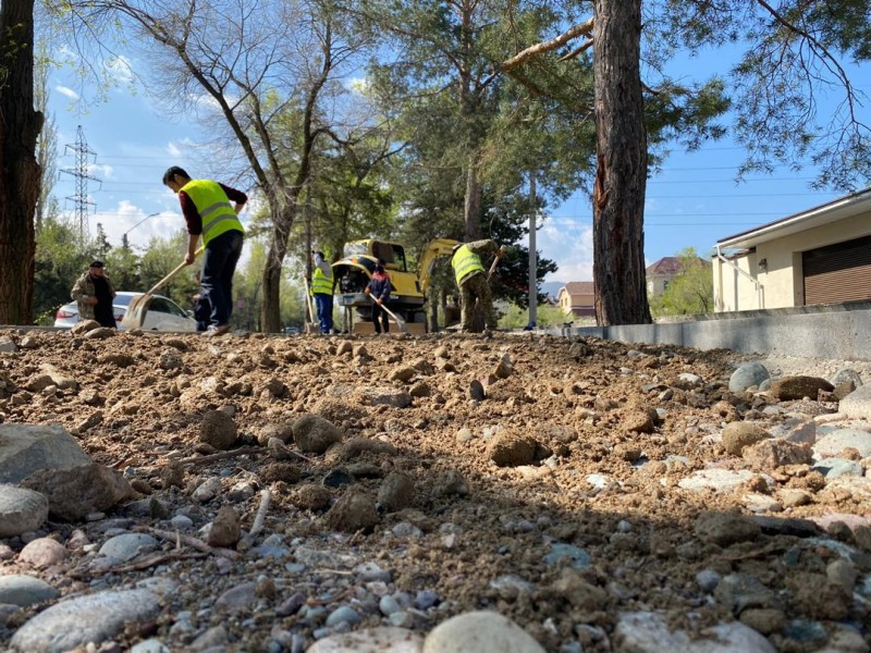 В разгаре строительство кольцевой велодорожки в южной части города, сотрудники «Бишкекасфальсервис» готовят грунт к прокладке асфальта вдоль ул. Байтик Баатыра.