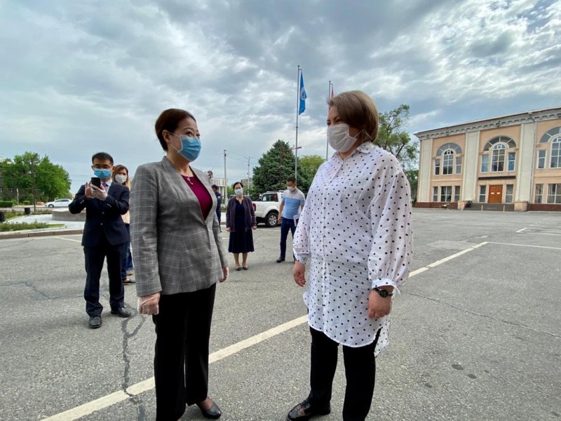 Посол КНР в Кыргызстане Ду Дэвэнь вручила вице-мэру по социальной политике Татьяне Кузнецовой 10 тысяч медицинских масок, 300 защитных очков, 200 костюмов, 200 мед.шапочек и 30 бесконтактных инфракрасных термометров.