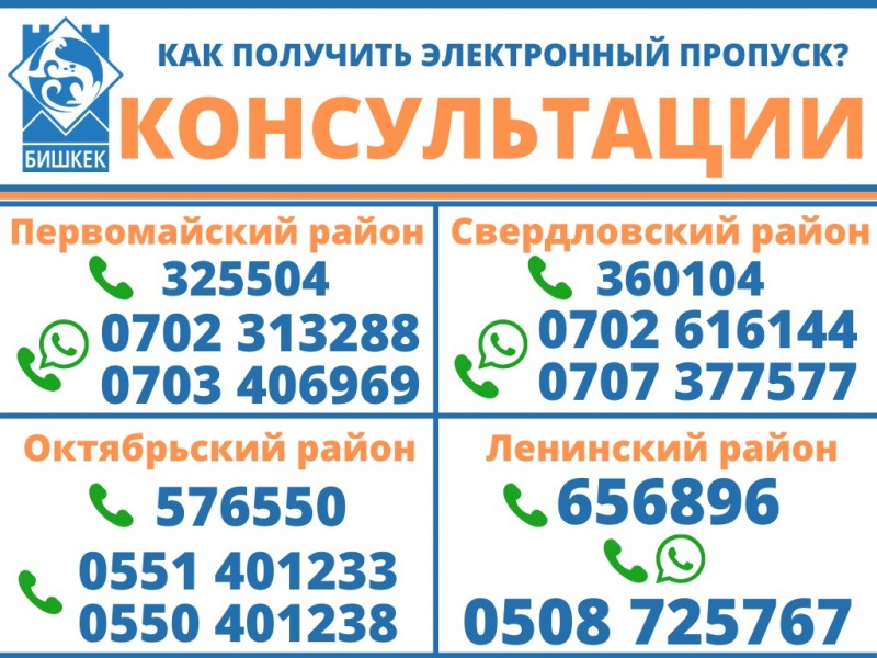 Дорогие горожане! В целях оптимизации процесса выдачи электронных разрешений (пропусков) по разрешённым видам деятельности в период ЧП предпринимателям будут содействовать районные акимиаты муниципалитета. Соответствующий приказ подписал комендант Бишкека А. Орозалиев.