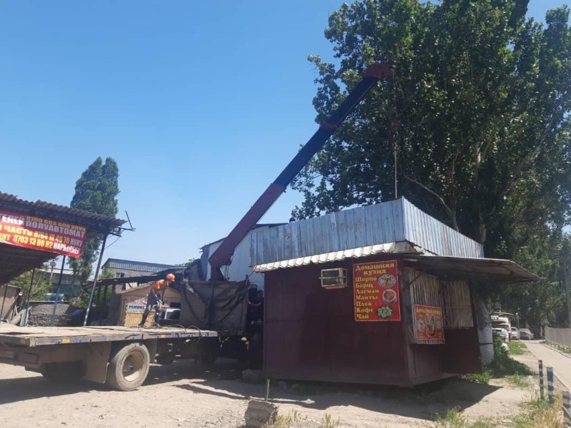 УЗС и Тазалык приступили к демонтажу трех самовольно установленных павильонов на перекрёстке улицы П. Лумумбы с улицами Кубаныч и Шаттык.