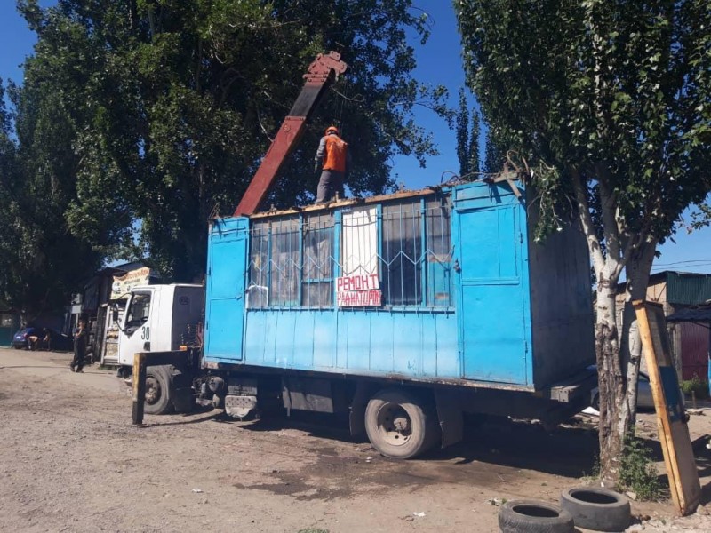 Обычный день сотрудников управления землепользования и строительства (УЗС) и спецподразделения МП «Тазалык» начинается с демонтажа незаконно установленного павильончика.