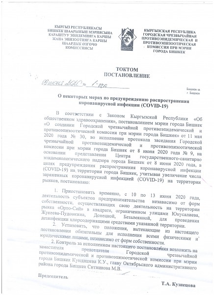 Глава ЧППК (городской чрезвычайной противоэпидемической и противоэпизоотической комиссии), вице-мэр столицы Т. Кузнецова постановила приостановить деятельность рынка «Орто-Сай» с 10 по 13 июня 2020 года для проведения тотальной дезинфекции рынка.