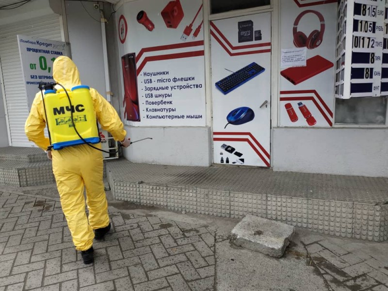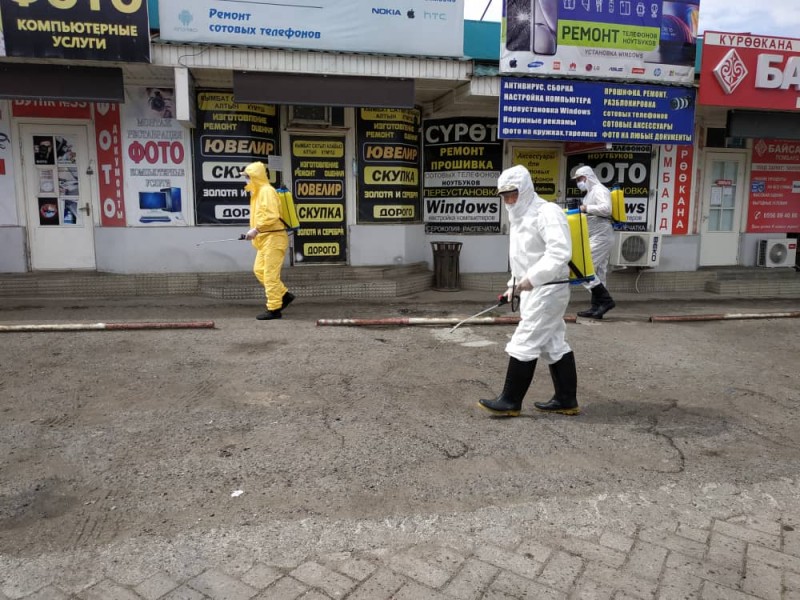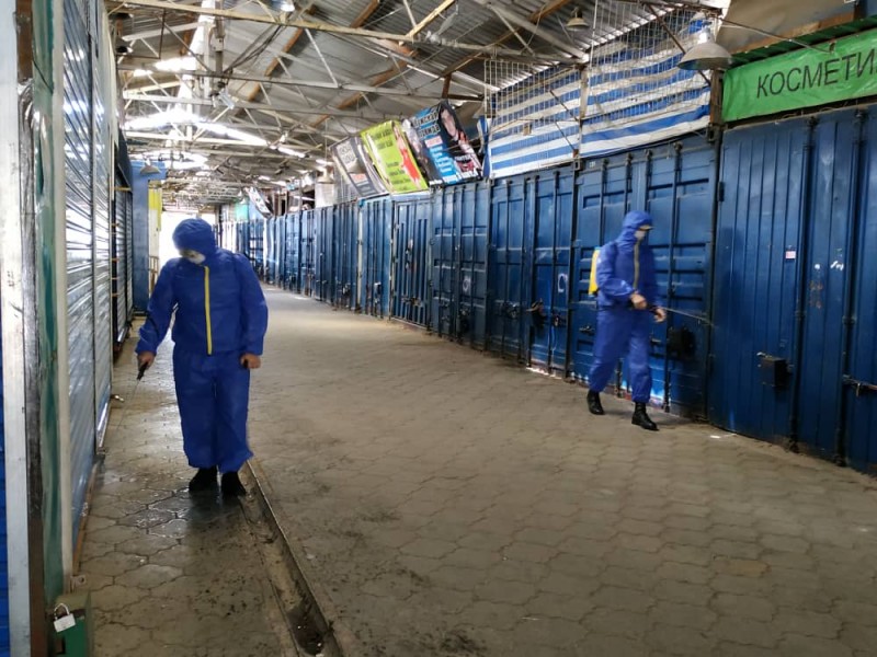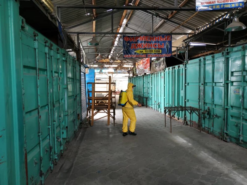 Прямо сейчас на рынке «Орто-Сай» проходит полная дезинфекция. Порядка 10 сотрудников МЧС тщательно обрабатывают каждый контейнер, торговые точки хлоросодержащей спецсмесью под контролем главного санврача центра Госсанэпидемнадзора.