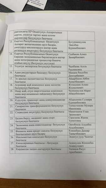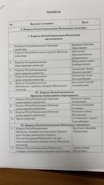 Главный санитарный врач столицы Кубан Кундашев оштрафовал сотрудников аппарата правительства КР за несоблюдение санитарных требований в эпоху пандемии. Составлены протоколы по статье 150 Кодекса о нарушениях «Нарушение требований технических регламентов, санитарных правил, гигиенических нормативов и иных нормативных правовых актов в области общественного здравоохранения» в отношении руководства кабмина, сотрудников секретариата и аппарата правительства КР, предусмотрен штраф - по пять тысяч сомов.