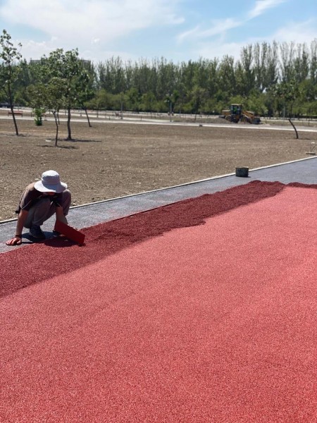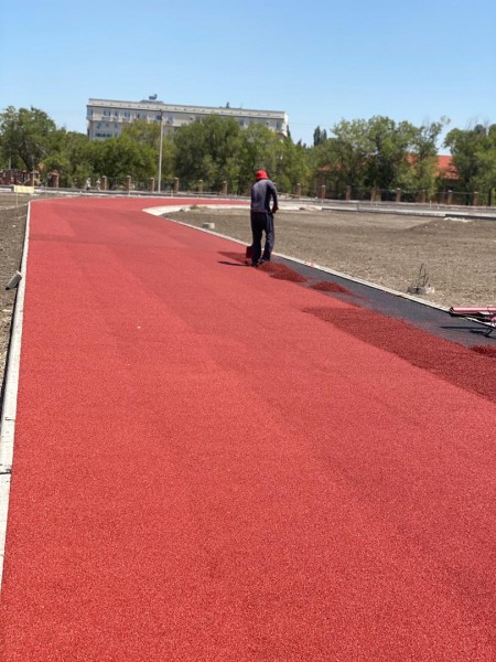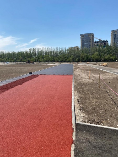Прямо сейчас идет строительство спортивной зоны, здесь предусмотрены футбольное, баскетбольное поля, объемная шахматная доска и велодром, все это будет окружено беговой дорожкой, которую мы начали укладывать резиновым покрытием.
