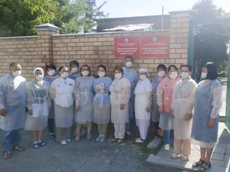 200 одноразовых халатов, 1 тысячу 750 штук медицинских масок, перчаток, 150 литров антисептика, 28 санитайзеров и 5 бесконтактных термометров приняла директор СЦРДиС Чолпон Арыкпаева.