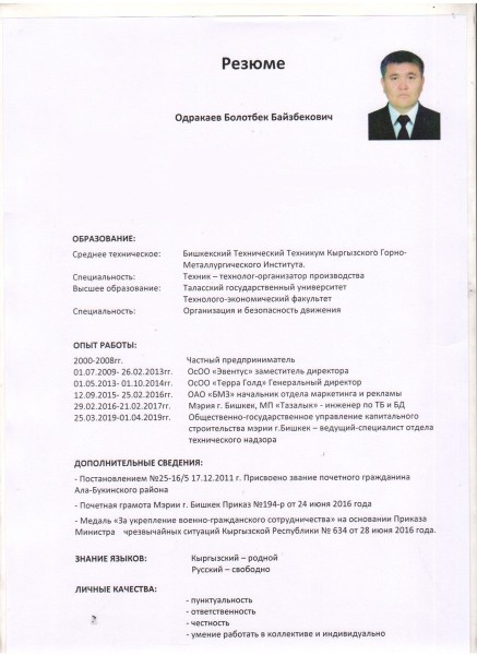 Ранее занимал должность ведущего специалиста отдела технического надзора общественно-государственного управления капитального строительства мэрии города Бишкек (ОГУКС).