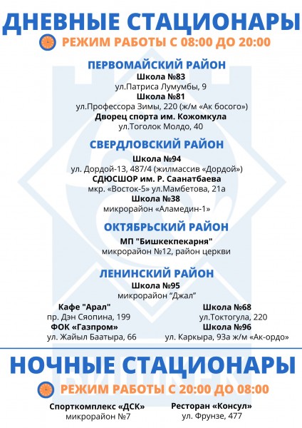 В Бишкеке с 8 утра до 8 вечера можно получить медицинскую помощь в дневных стационарах, их у нас теперь 12. В остальное время медпомощь оказывается в двух ночных.