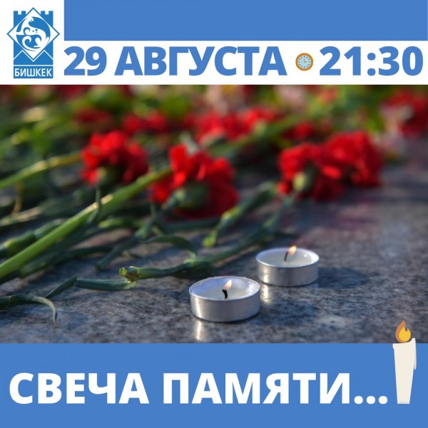 Дорогие горожане! 29 августа мэрия города Бишкек проводит масштабный флешмоб “Свеча памяти”. Вспомним и помянем всех погибших от COVID-19 и других болезней. Ровно в 21:30 выключим свет в наших домах, откроем окна и зажжем свечи, помолчим, почтим память. На несколько минут будет отключено и уличное освещение по линии квадрата пр. Чуй (от ул. Бейшеналиевой до ул. 7 апреля), пр. Ч. Айтматова, ул. Б. Баатыра, ул. И. Ахунбаева, ул. Киевская (от ул. Бейшеналиевой до ул. Ибраимова).