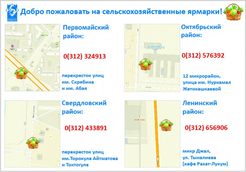 В Первомайском районе ярмарка развернется на пересечении улиц имени К.Скрябина и улицы Абая (рядом с Кыргызским национальным аграрным университетом им. К.И.Скрябина)