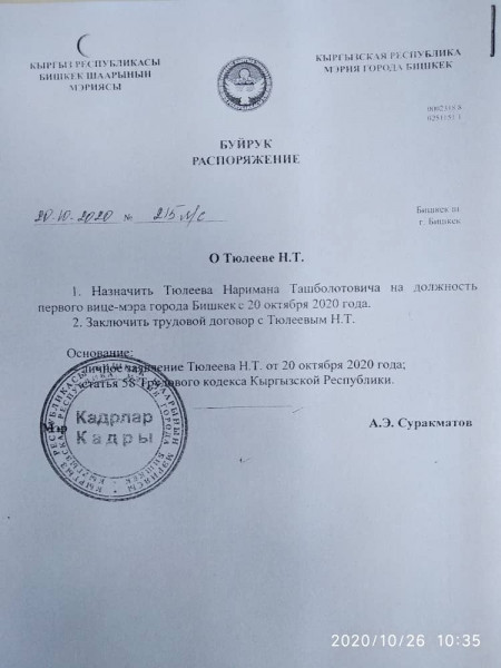 Мы, мэрия города Бишкек, официально заявляем, что у нас есть законный исполняющий обязанности мэра столицы, первый вице-мэр Нариман Тюлеев. Его на законных основаниях назначил экс-мэр Азиз Суракматов (п.5, ч.1, ст.21 и ст. 27 Закона КР «О статусе столицы»), чья отставка была принята и.о. президента КР, премьер-министром КР Садыром Жапаровым 21 октября 2020 года.