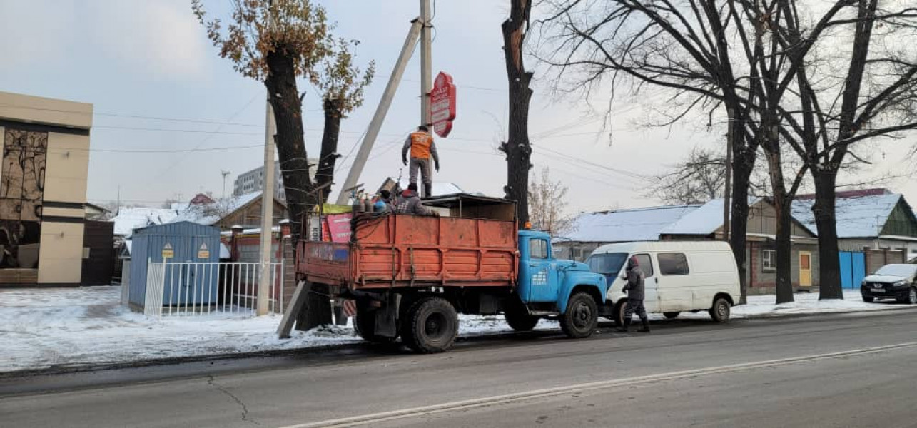 В связи с отсутствием разрешительных документов совместно с представителями МП "Бишкекреклама" в рамках рейдовых мероприятий по устранению незаконных рекламных конструкций демонтировано 62 рекламные конструкции, штендеры и силомеры.