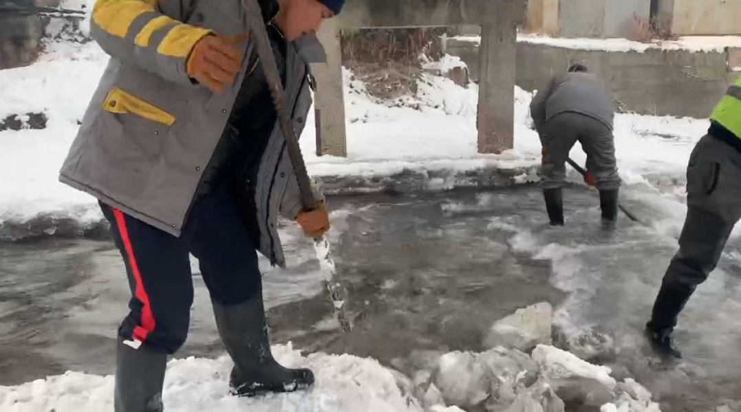 Сотрудники муниципального предприятия “Бишкекзеленхоз” производят ручную колку льда для повышения проходимости воды в русле реки Ала-Арча.