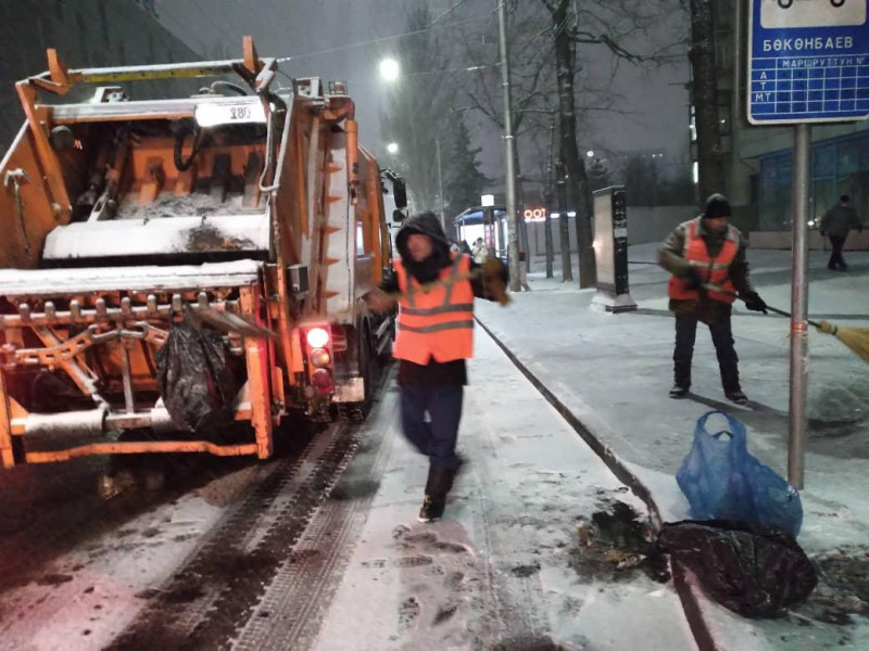 В штатном режиме по городу Бишкек работают порядка 640 дворников, 123 грузчика, сотрудники по саночистке и команда из более ста человек по вывозу ТБО. Для санитарной очистки привлечено 52 единицы спецтехники, для вывоза мусора – 47 спецавтомобилей.