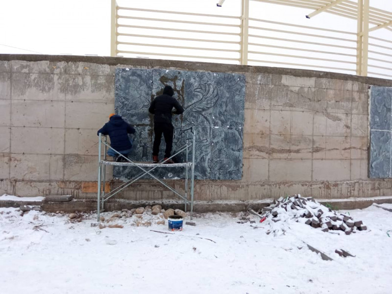 Специалисты уже установили металлические конструкции для посадочных мест в театре. Ведутся работы по обшивке металлической инсталляции «Юрты» натуральными камнями.