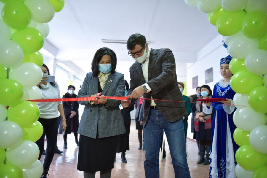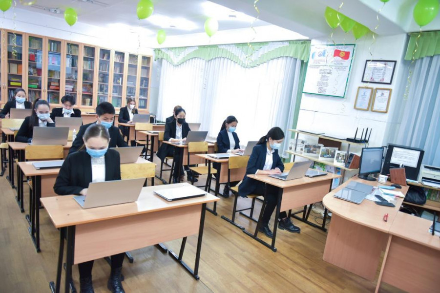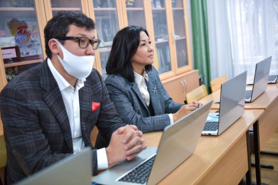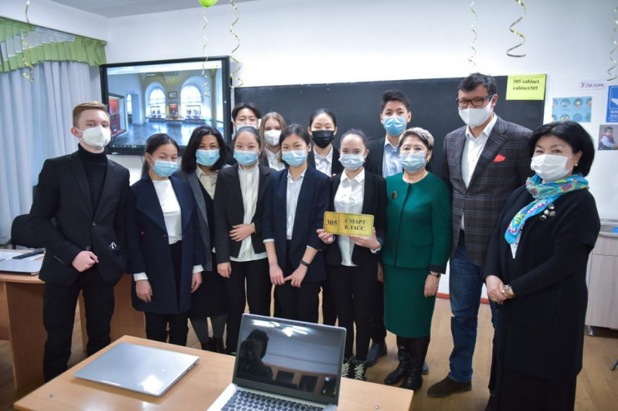 На первый открытый урок в новой смарт-лаборатории вместе с учениками пришли вице-мэр по социальным вопросам Айжан Чыныбаева и представитель компании Weidong Cloud Education Group в Кыргызстане Таалай Дайырбеков.