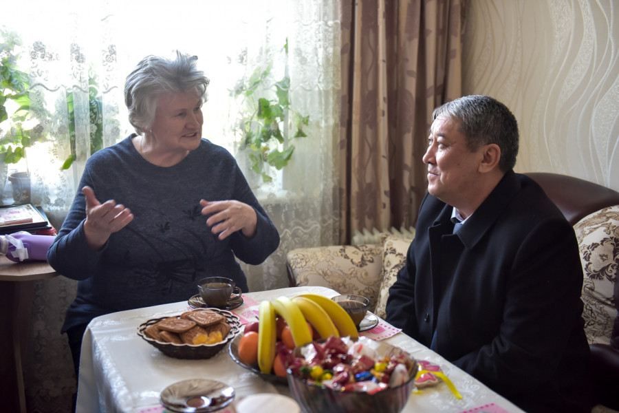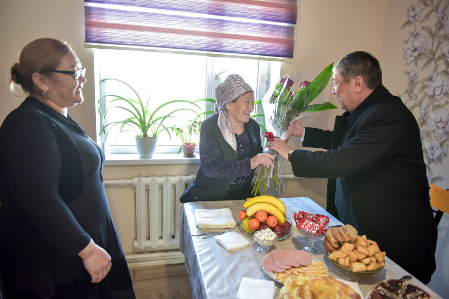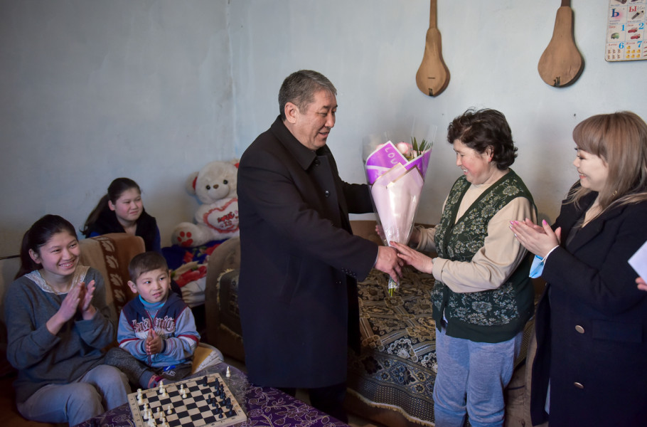 И.о.градоначальника поздравил и Кымбат Тюлебаеву - маму восьмерых детей, домохозяйку. Она является получателем пособия “Үй - бүлөгө көмөк” и ежеквартальной стипендии.