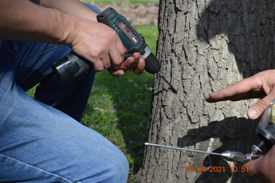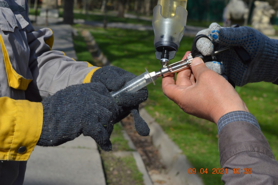 Сотрудники муниципального предприятия «Бишкекзеленхоз» совместно с одним из ведущих энтомологов национальной академии наук КР Иваном Хегай начали проводить инъекцию дубов.