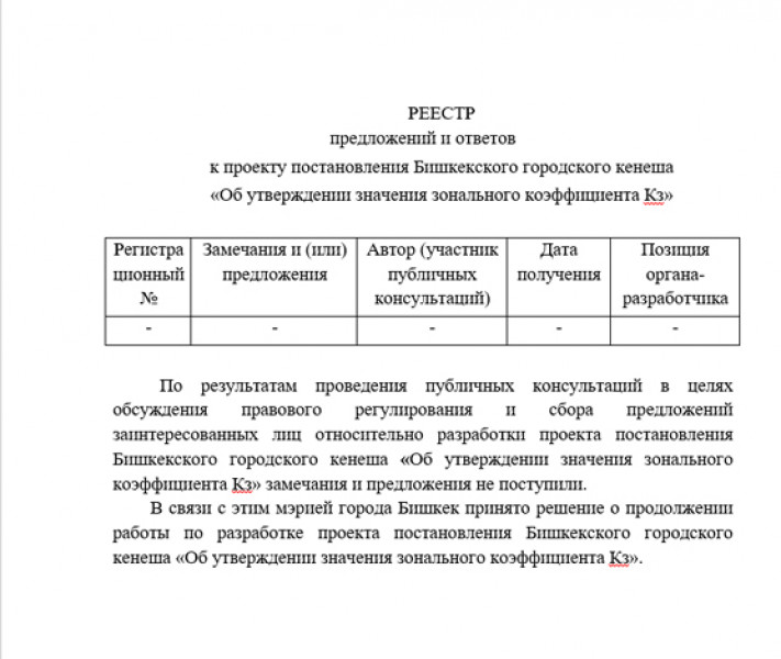 По результатам проведения публичных консультаций в целях обсуждения правового регулирования и сбора предложений заинтересованных лиц относительно разработки проекта постановления Бишкекского городского кенеша «Об утверждении значения зонального коэффициента Кз» замечания и предложения не поступили.
