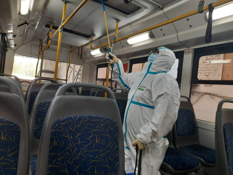 Каждое утро мы обрабатываем поручни, ручки сидений, руль, панели и входные двери транспорта специальным дезинфицирующим средством, проводим плановый инструктаж водителей по соблюдению масочного режима.
