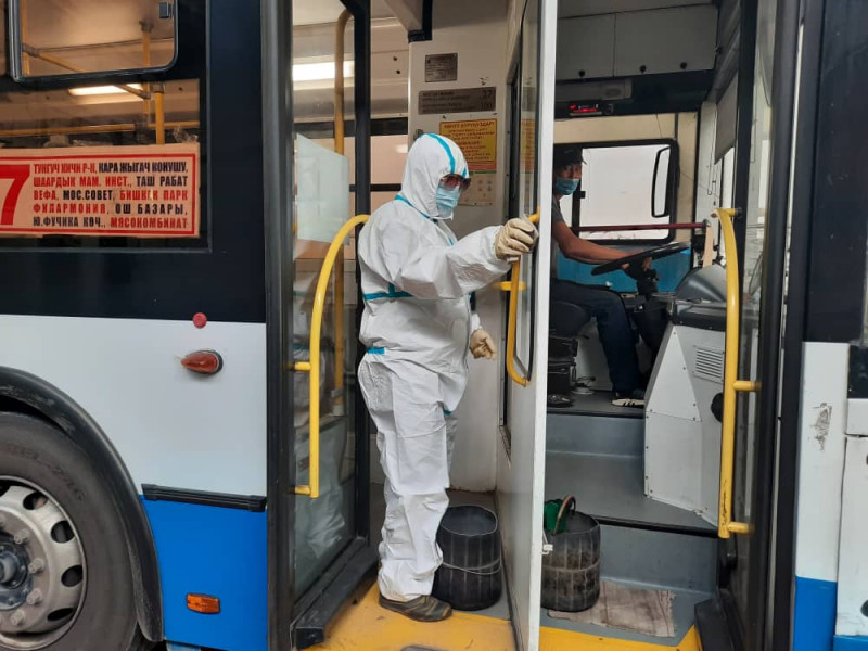 Для безопасности пассажиров сотрудники муниципального предприятия «Бишкекское троллейбусное управление» ежедневно проводят санитарную обработку и дезинфекцию салонов троллейбусов.