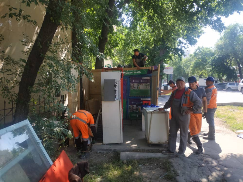 На пересечении ул.Тимирязева-ул.Токтогула демонтирован самовольно возведенный объект облегченного типа под пристройку к газетному киоску.