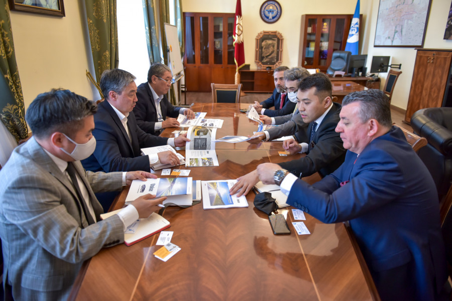 В муниципалитете Бишкека состоялась встреча и.о. мэра Бишкека Бактыбека Кудайбергенова с председателем правления «ТНД Глобал» Тургай Чалыкер, заместителем генерального директора компании «Отокар Отомотив ве Савунма Санайи» Басри Акгюль, генеральным директором ТРЦ «Бишкек Парк» Фатих Зенгин и руководителем отдела коммерции ТРЦ «Бишкекпарк» Нурсултаном Баялиевым.