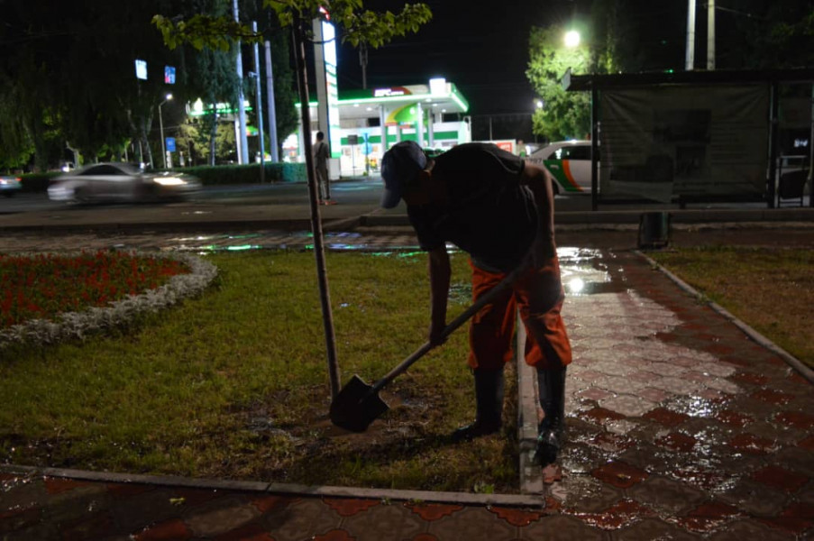 В Первомайском районе ночной полив проводился на бульваре Эркиндик от улицы Боконбаева до Московской, в сквере имени Тоголок Молдо.