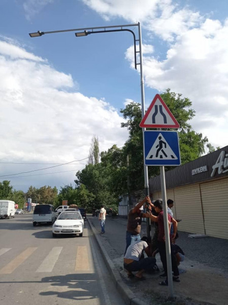 Теперь вечером для удобства горожан, переходящих дорогу, на пересечении улиц Махатмы Ганди и Тулебердиева и на отрезке улиц А. Масалиева и Д.Садырбева установили двусторонний знак пешеходного перехода с подсветкой и шесть дополнительных светодиодных светильников.