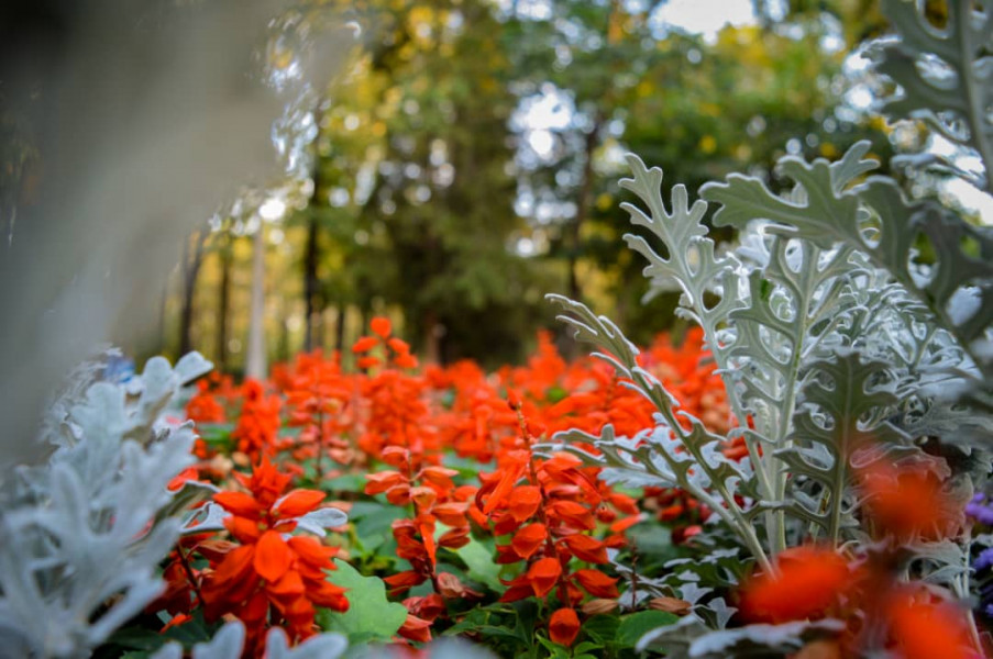 На сегодняшний день высажены: сальвии (красные, белые, фиолетовые), петунии, георгины, тагетес, агератум, львиный зев, цинерарии, цинии и многие другие.