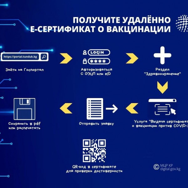 Теперь сертификат о вакцинации против COVID-19 можно получить удаленно в электронном виде через Государственный портал электронных услуг portal.tunduk.kg.