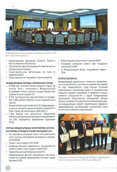 Евразийское отделение Всемирной организации «Объединенные Города и Местные Власти» выпустило книгу «Развитие международного межмуниципального сотрудничества в Российской Федерации и странах Евразии», куда вошла статья о городе Бишкек.
