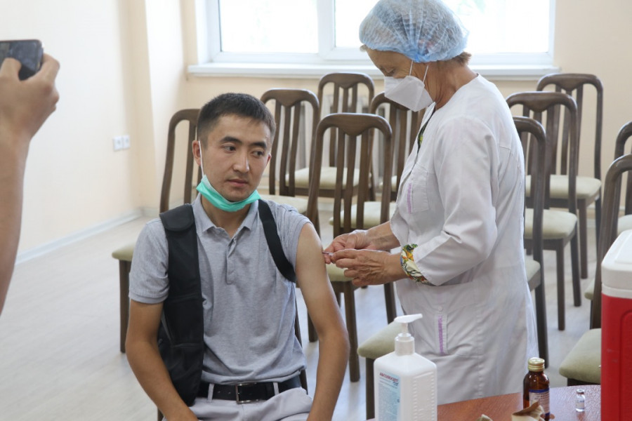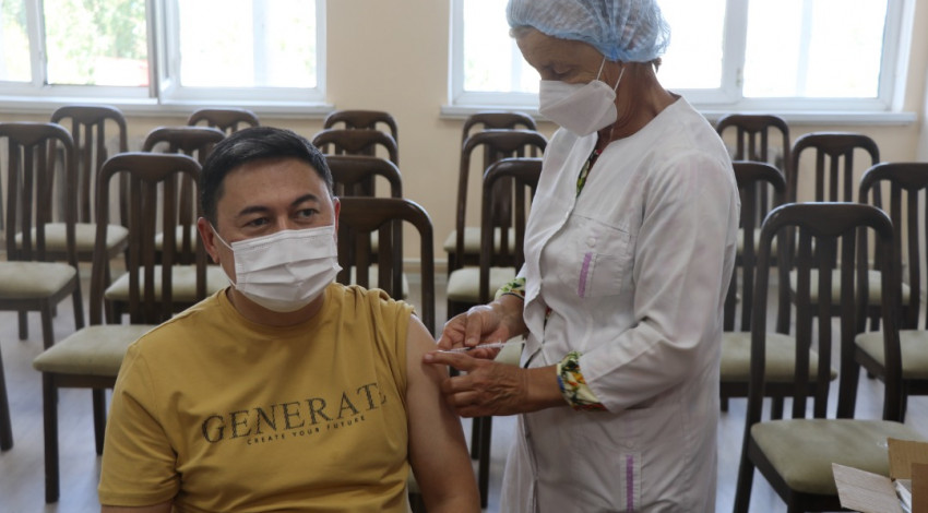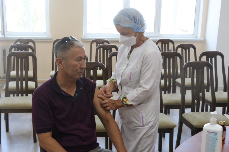 Глава Ленинского района Мурат Осмонов, сотрудники акимиата, МТУ, директоры школ, учителя и квартальные комитеты прошли вакцинацию против COVID-19.