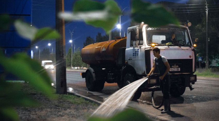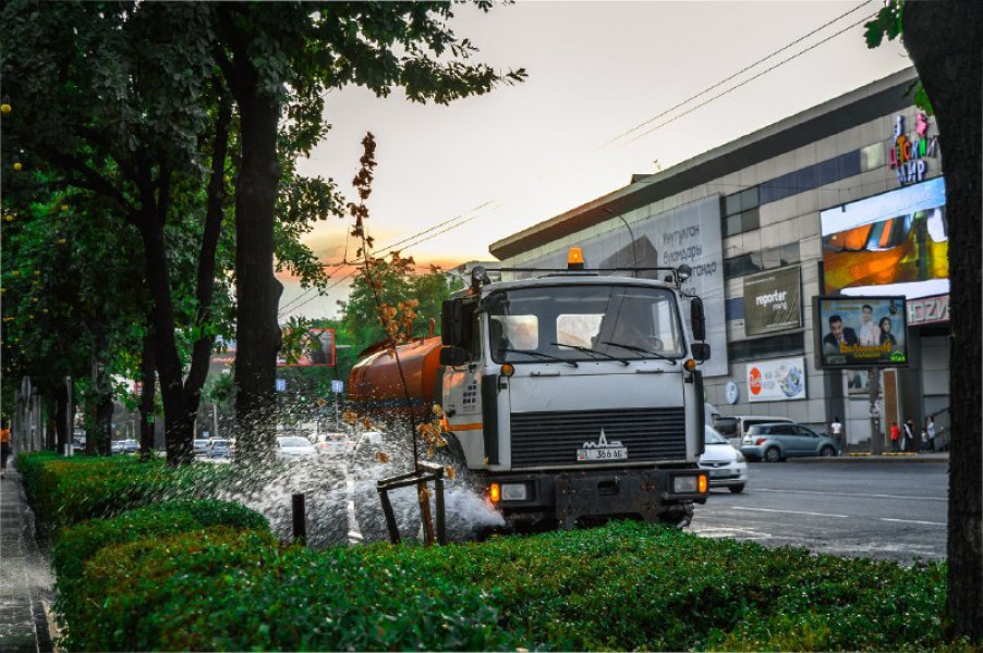 С 20:00 до 23:00 часов производится автополив зелёных насаждений города с привлечением 12 единиц спецтехники МП «Тазалык» и 5 единиц техники МП «Бишкекзеленхоз».