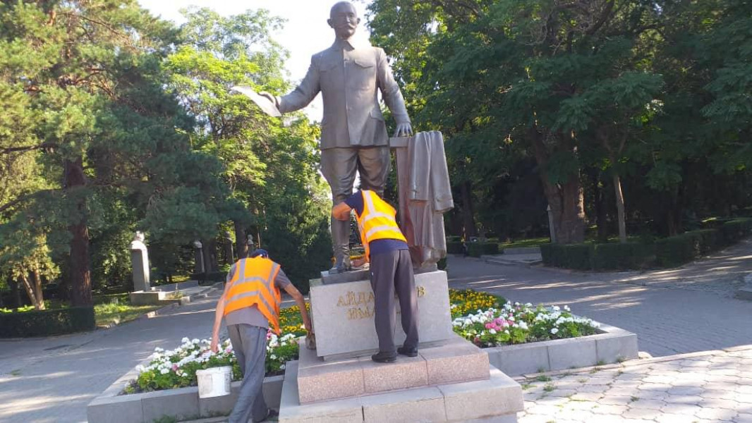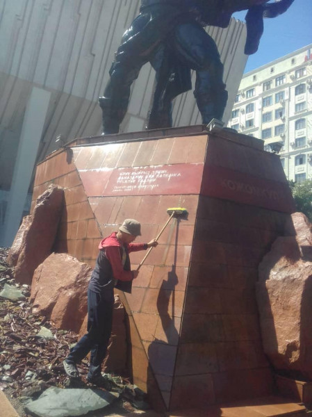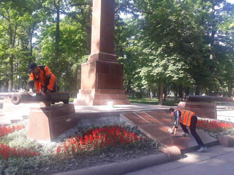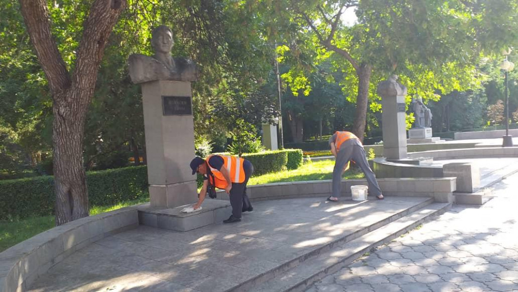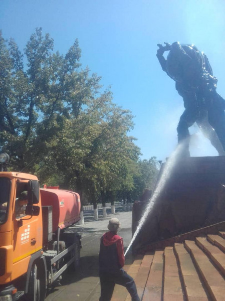 Сотрудники муниципального предприятия «Тазалык» продолжают работу по мойке памятников.