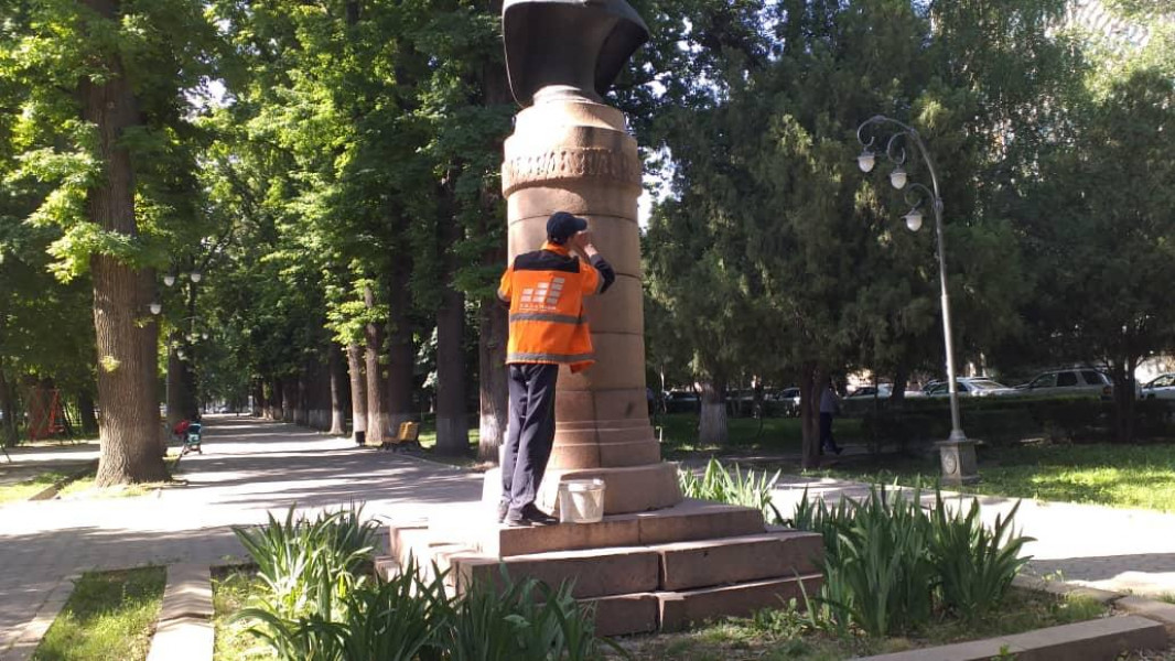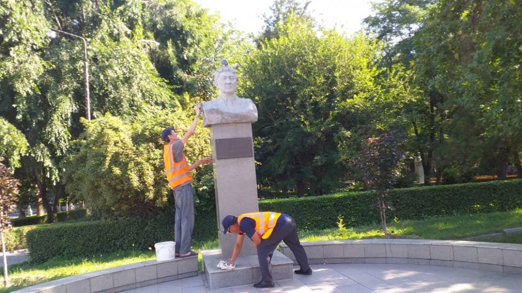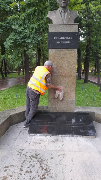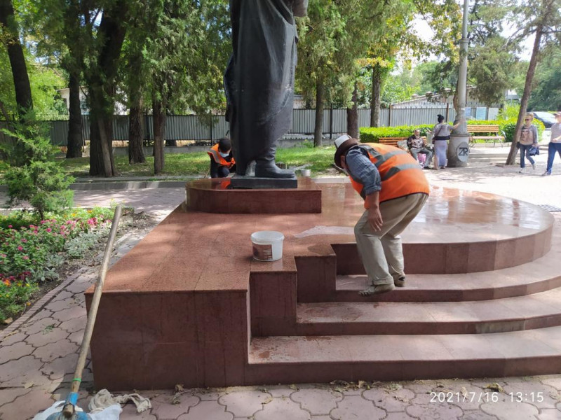 Мы освежили памятники монумент Уркун, памятники Кожомкулу, Юдахину, Шабдан Баатыру, Калыку Акиеву, бюсты Манасчы, Бегельдинова и расположенные на Аллее Героев. Для работы привлечены три поливомоечные машины, одна автовышка и 10 сотрудников предприятия.