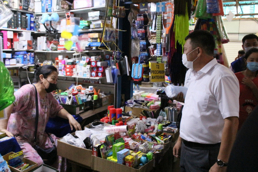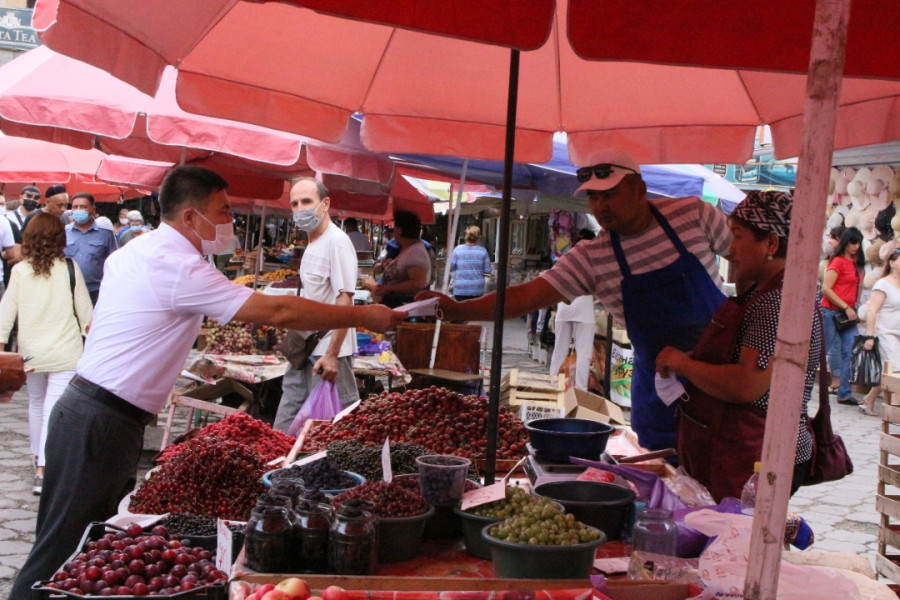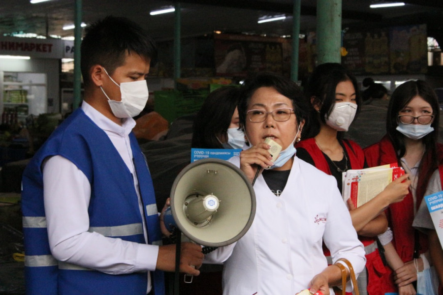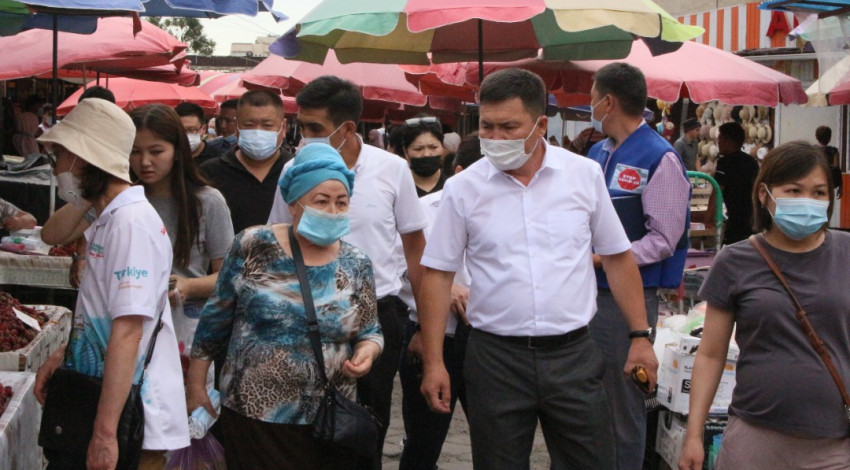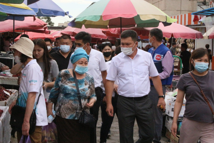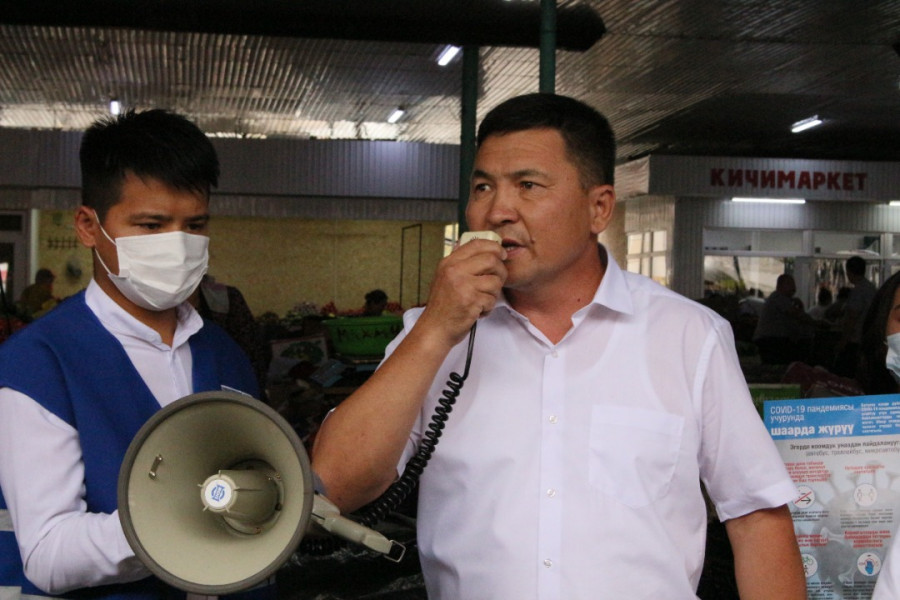 Глава Октябрьского района Мирлан Эшкожоев совместно медицинскими работниками ОЦМС №6 и волонтёрами «Красного Полумесяца» провели антиковидную акцию «Надень маску – сохрани жизнь!» на рынке «Орто-Сай».