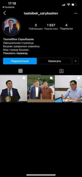 В социальной сети Instagram появилась страница исполняющего обязанности мэра Бишкека Таалайбека Сарыбашова.
