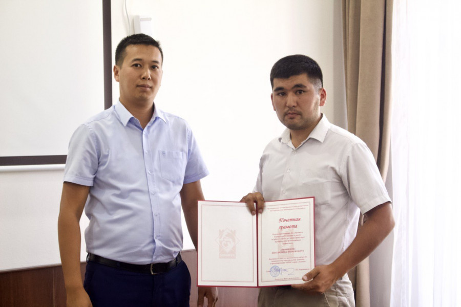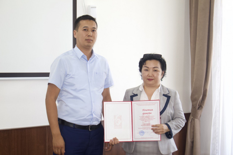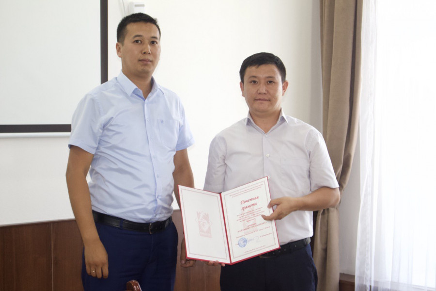 Руководитель аппарата муниципальной администрации Акматбек Кожомкулов поздравил сотрудников и вручил им Почётные грамоты.
