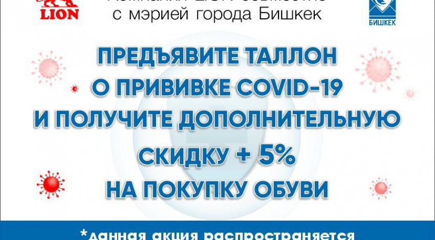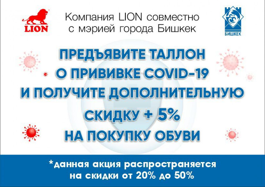 С сегодняшнего дня и до 31 декабря включительно жители и гости Кыргызстана, привившиеся от коронавирусной инфекции, могут принять участие в акции и получить дополнительную скидку в 5% от сети обувных магазинов «Lion» по всему Кыргызстану. Скидка действует в течение трех дней после получения вакцины и для граждан и гостей КР старше 18 лет.