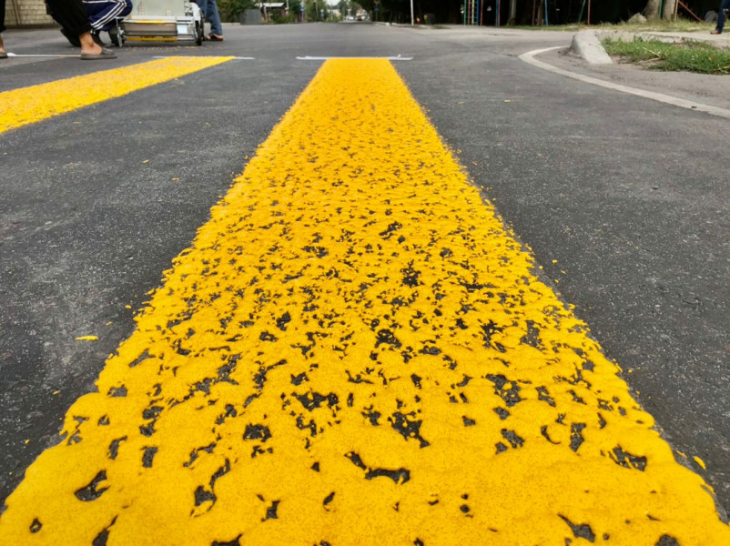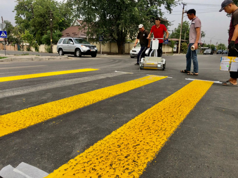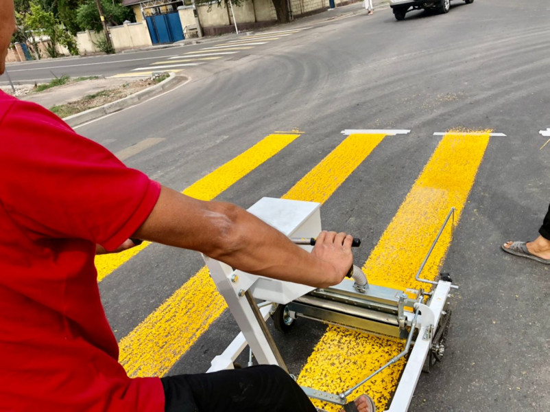 Накануне с представителями компании «Строительная техника и материалы» испробовали разметочную машинку «Шмелёк». Нанесли пешеходный переход на перекрестке улиц Орозбекова и Васильева.