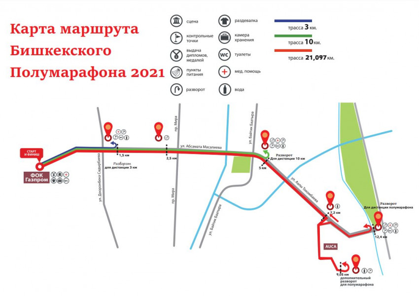 19 сентября в 8:00 часов от физкультурно-оздоровительного комплекса «Газпром» по адресу: ул. Жайыл-Баатыра № 66 стартует Бишкекский полумарафон.