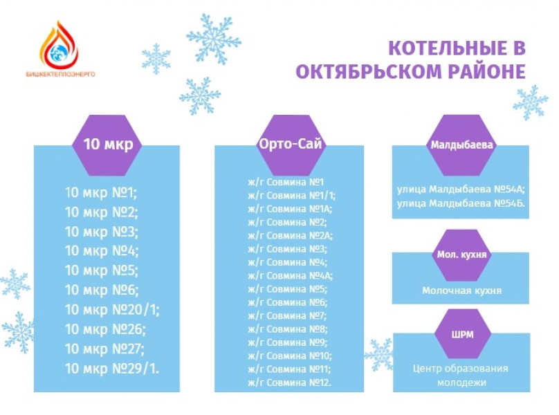 В Октябрьском районе функционирует 5 котельных коммунального предприятия «Бишкектеплоэнерго»: «10 микрорайон», «Орто-Сай», «Малдыбаева», «Молочная кухня» и ШРМ (ЦОМ).
